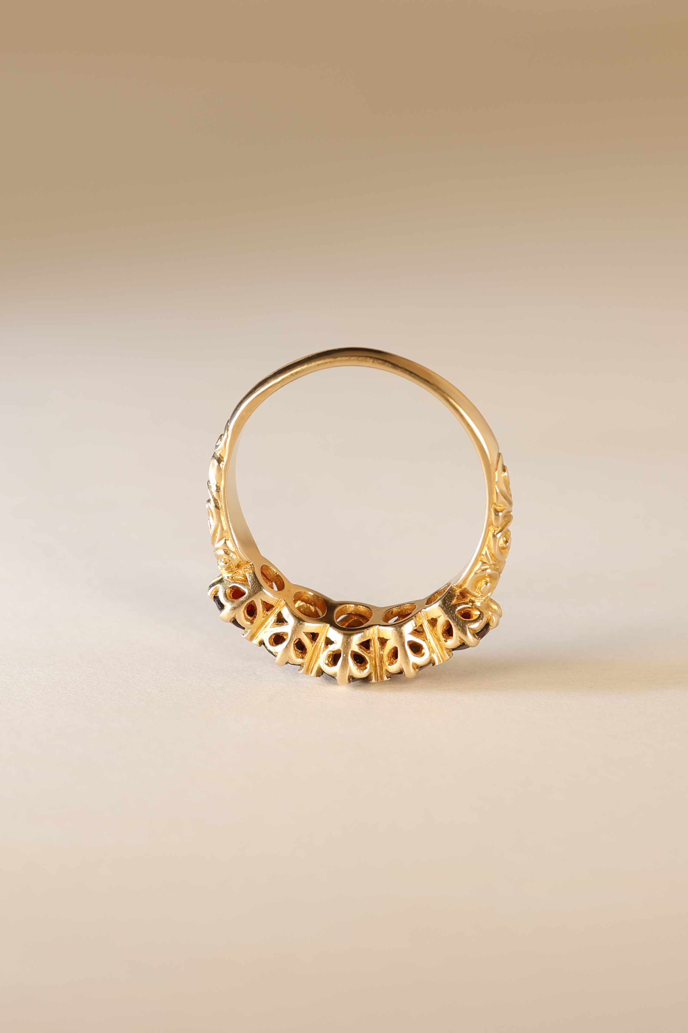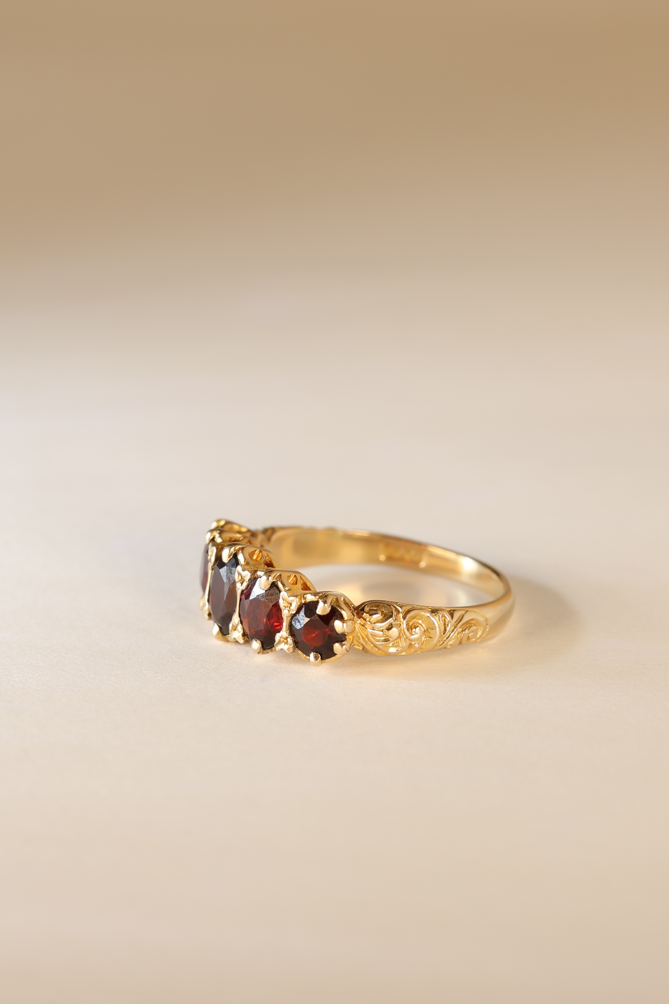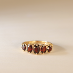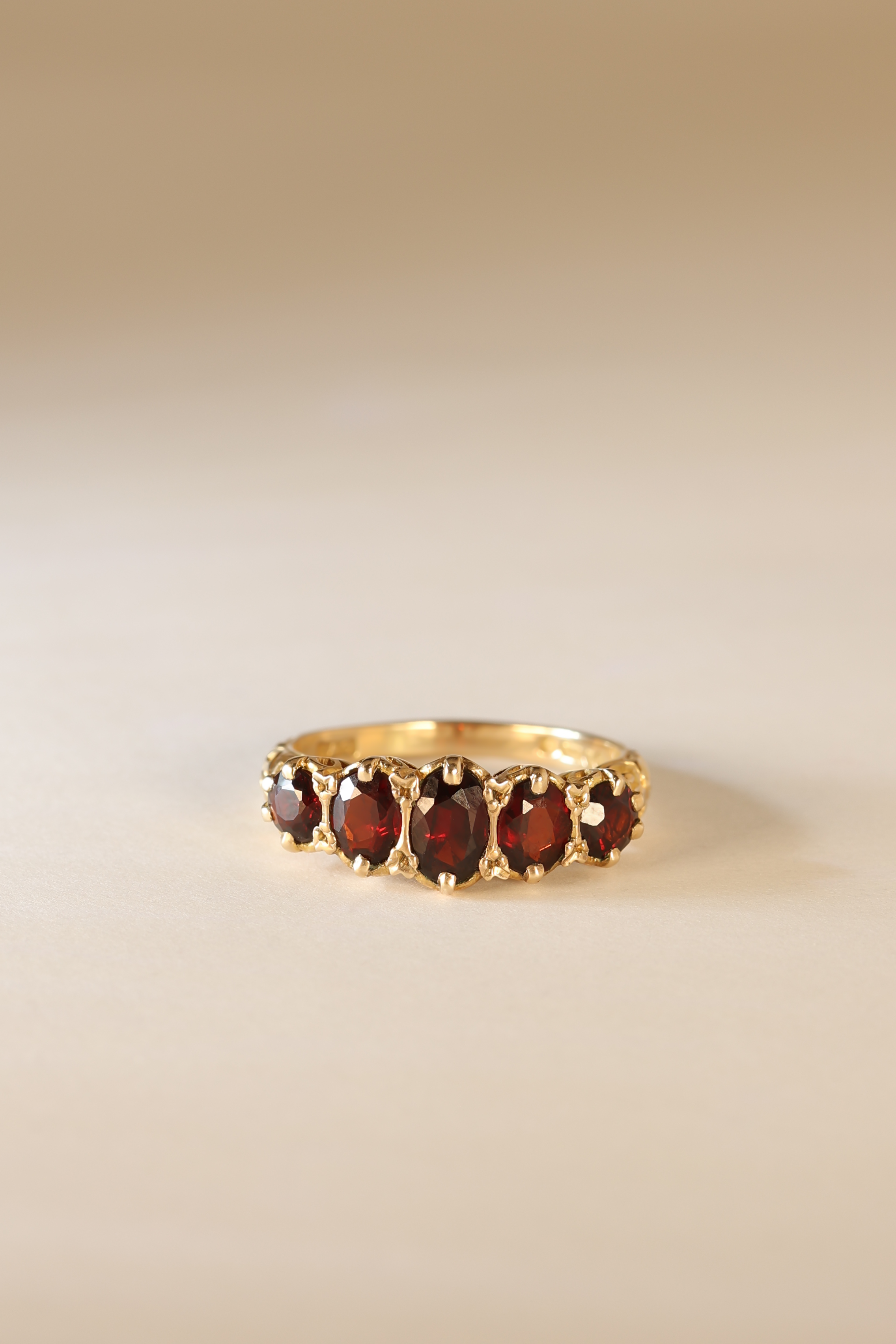 Discover the deep, velvety beauty of the 9K Vintage Garnet Row Ring, a piece with a warm and regal presence. The oval garnet stones shine with a rich, ruby-red glow that comes to life with every movement. The warm 9K gold frames the stones elegantly and enhances their intense colour. The ornate vintage setting adds timeless character and refined finesse to the design. Wear it solo for a bold statement or pair it with other rings for a chic, layered look. A classic jewel that enriches any outfit with depth and luxury.