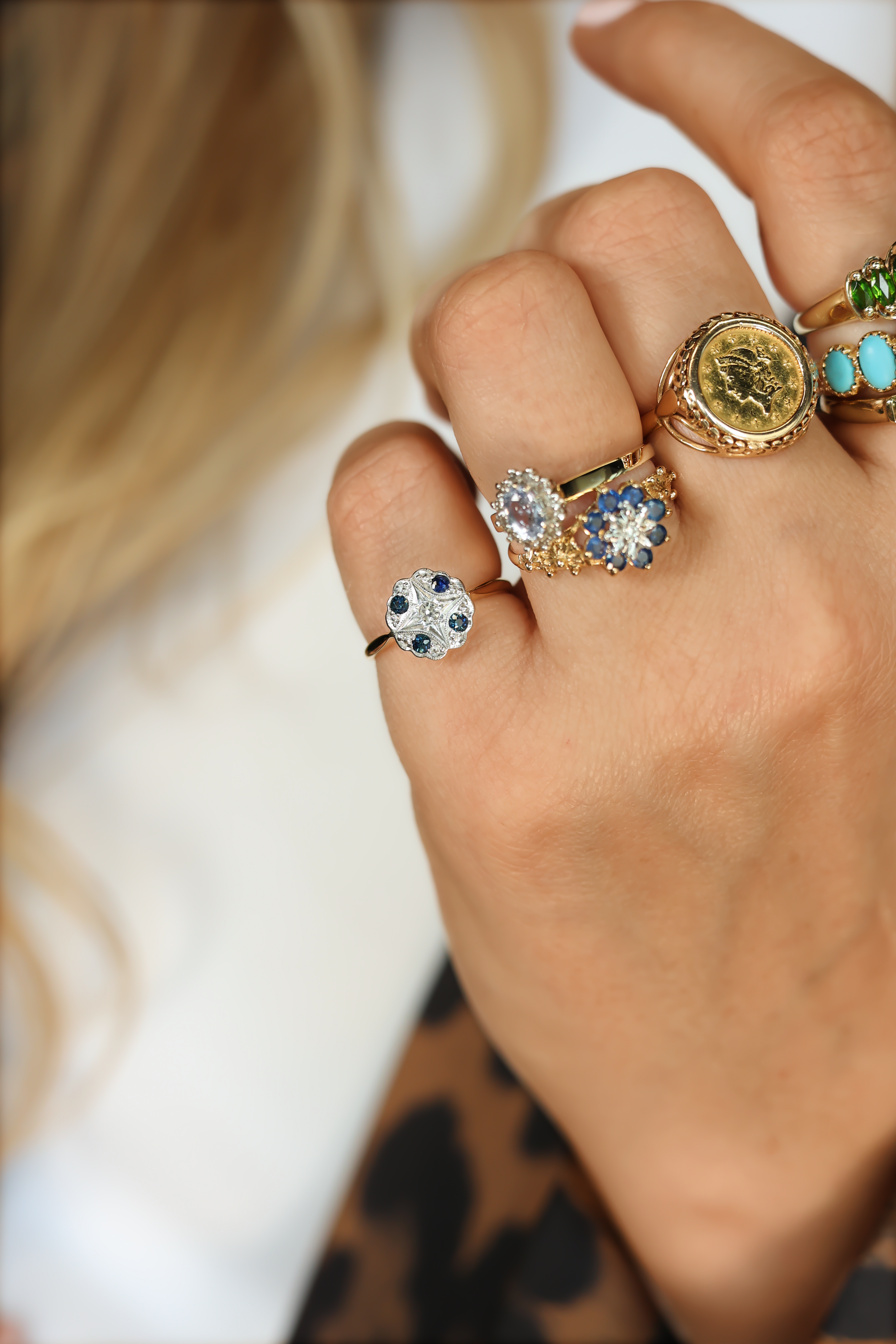 De 18K Vintage Saffier & Diamanten Cluster Ring is een tijdloze schat met betoverende schoonheid. Met zijn klassieke elegantie en vintage charme is deze ring een must-have voor elke sieradenliefhebber! Laat je verleiden door de magie van deze ring en ontdek waarom hij zo speciaal is. Met de centrale diamant en schitterende vier saffieren als accent is deze ring een echte blikvanger. De diepblauwe kleur van saffier straalt kracht en wijsheid uit en trekt direct de aandacht. Omringd door sprankelende diamanten krijgt de saffier een extra dimensie van glans en schittering.