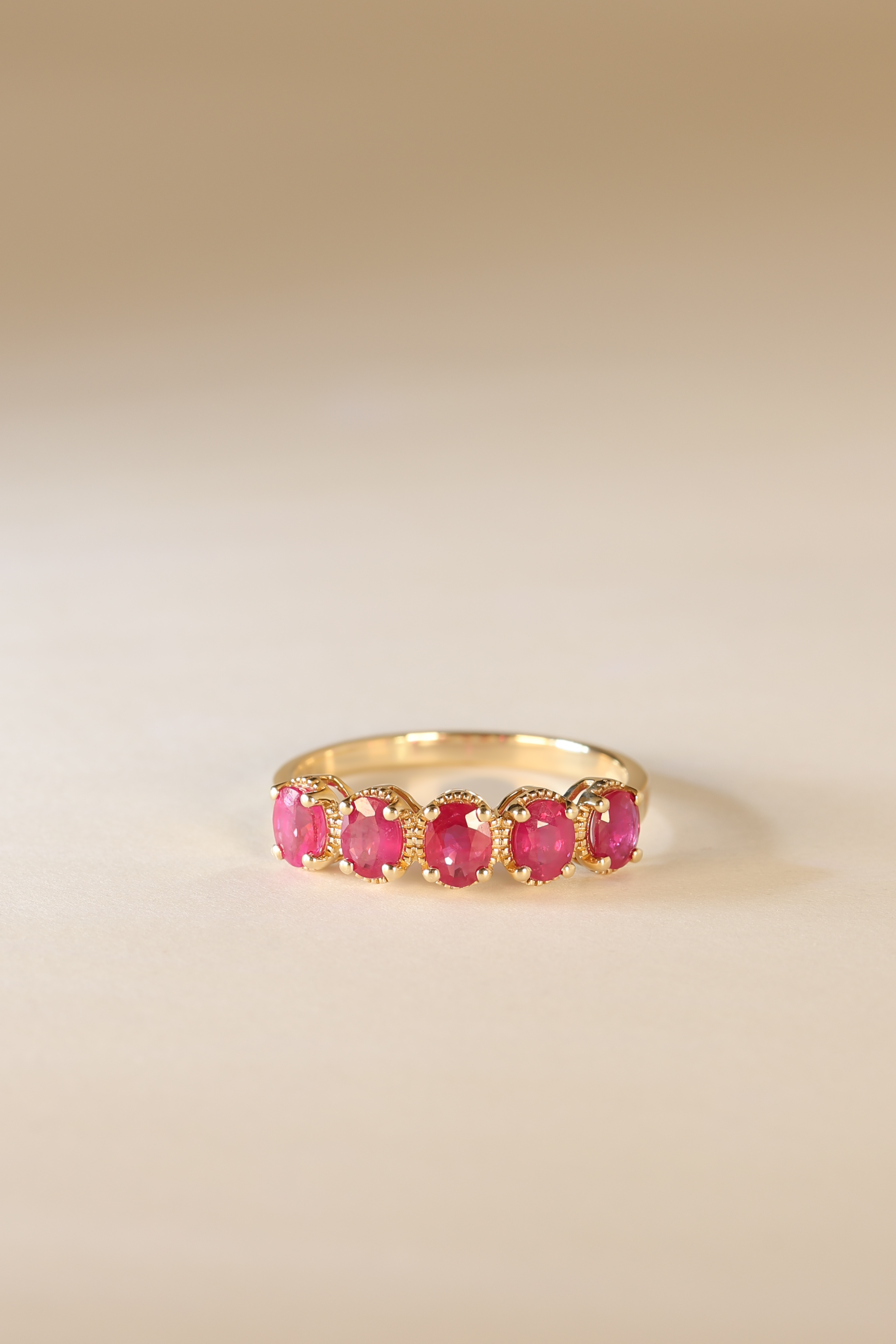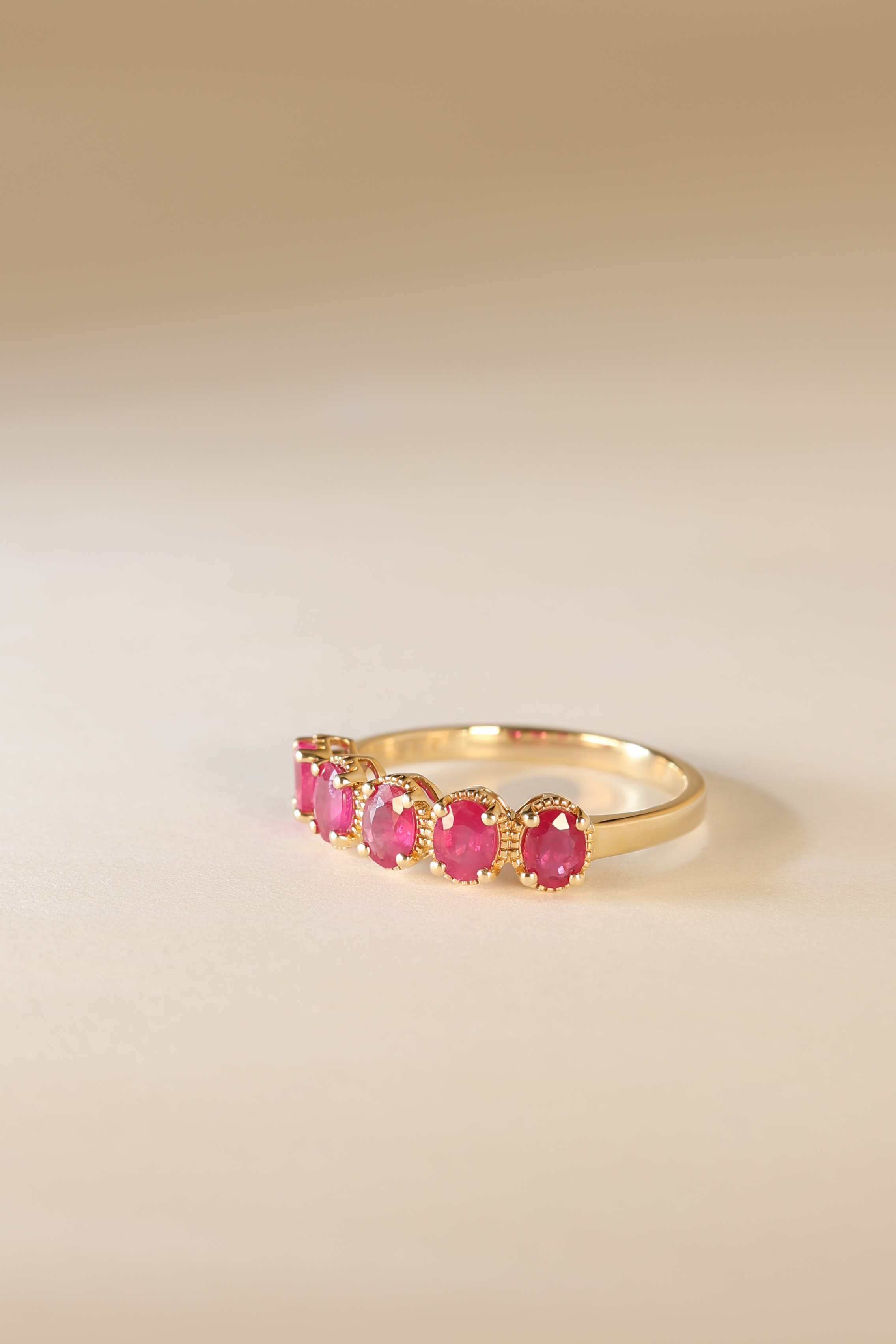 Laat je verleiden door de levendige luxe van onze 9K Ruby Row Ring, een adembenemend ontwerp dat kleur en elegantie perfect samenbrengt. De robijnrode edelstenen schitteren met een warme, vurige gloed en creëren samen een tijdloos en krachtig statement. De verfijnde zetting in 9K goud benadrukt elke facet van de robijnen en geeft de ring een klassieke, luxueuze uitstraling. Perfect voor liefhebbers van sieraden die karakter, passie en verfijning uitstralen. Draag haar solo voor een opvallend kleuraccent of combineer haar met andere favorieten voor een chique, gelaagde look. Een schitterend juweel dat elke outfit verrijkt met een vleugje glamour en romantiek.
