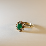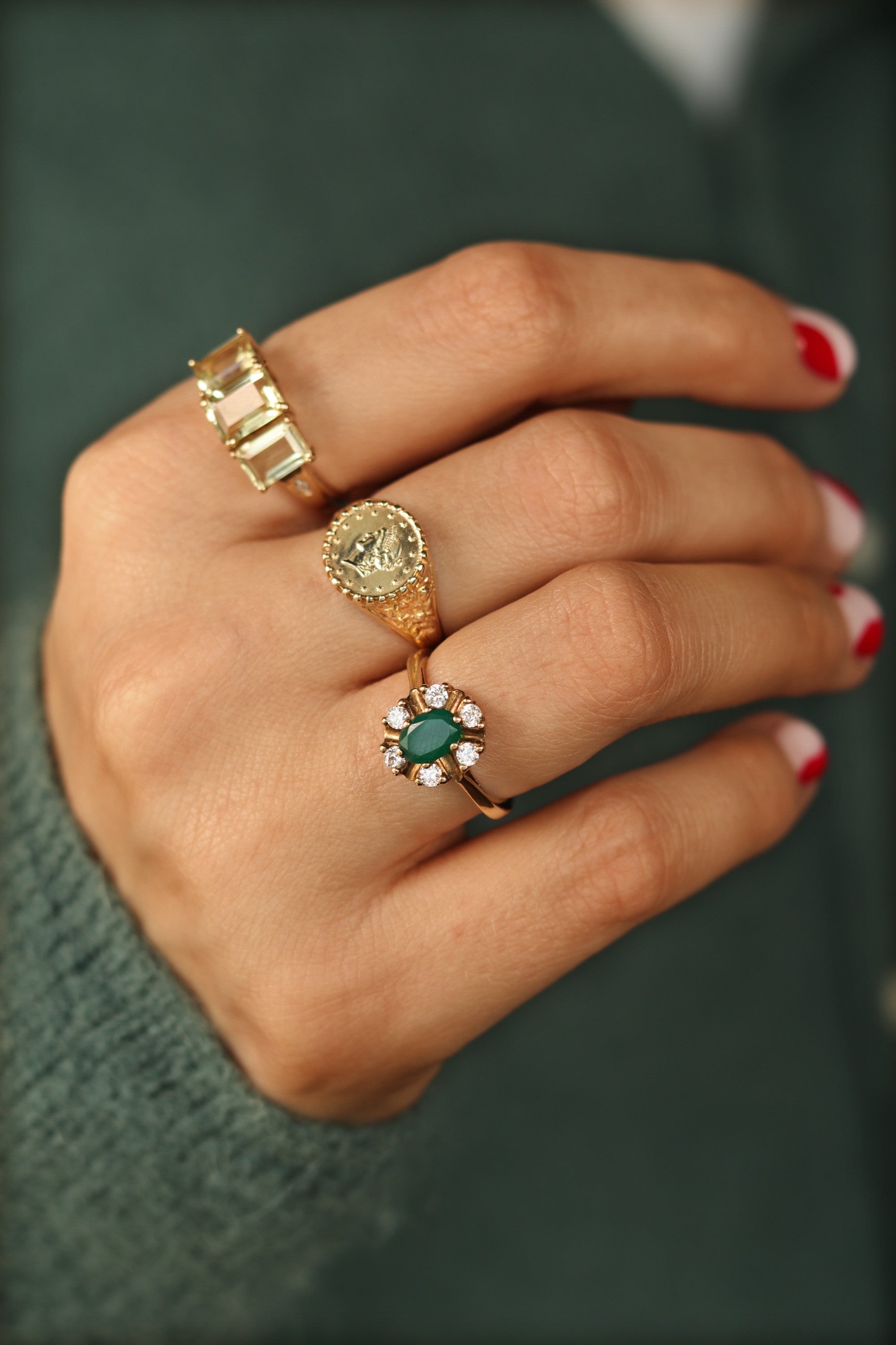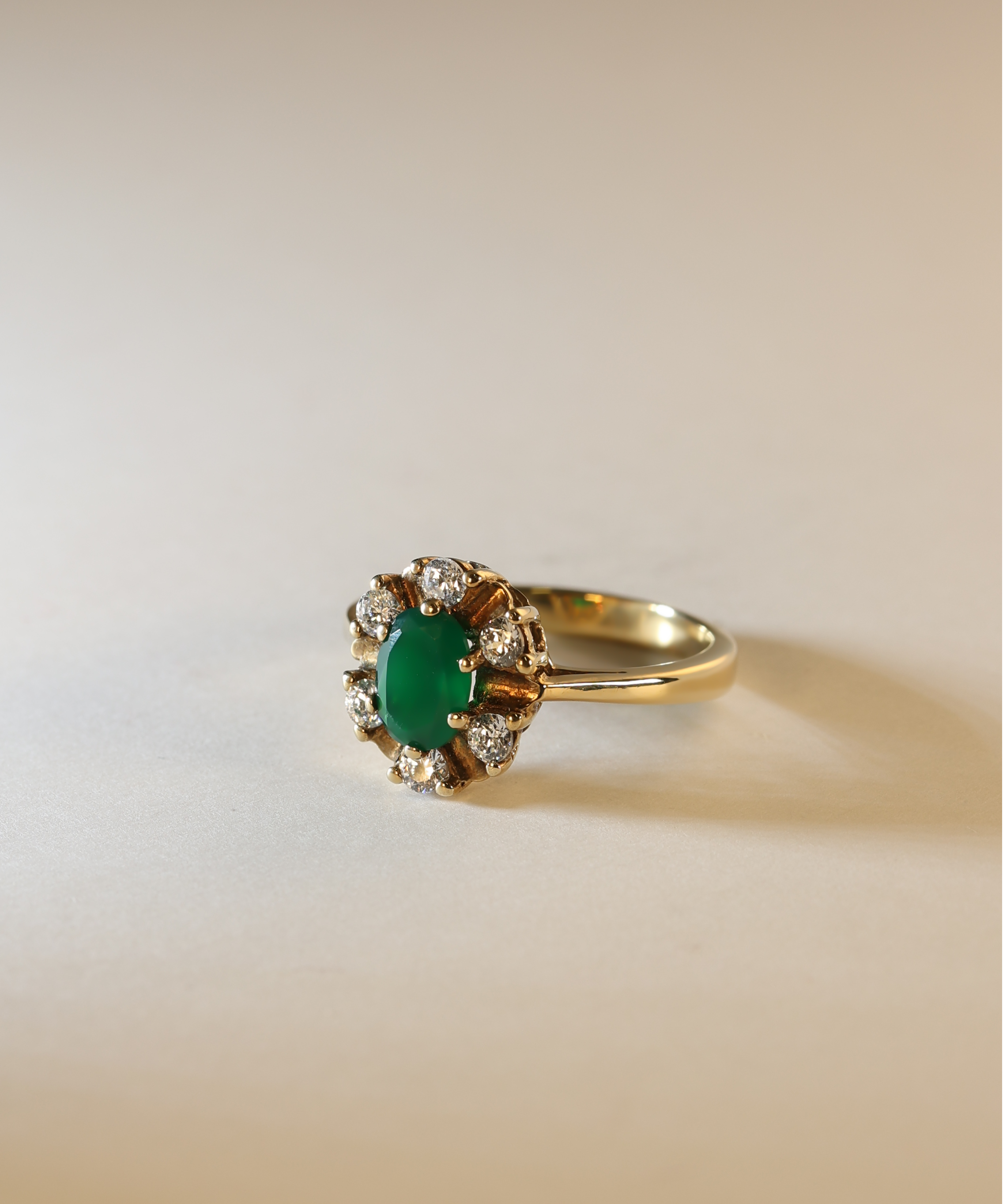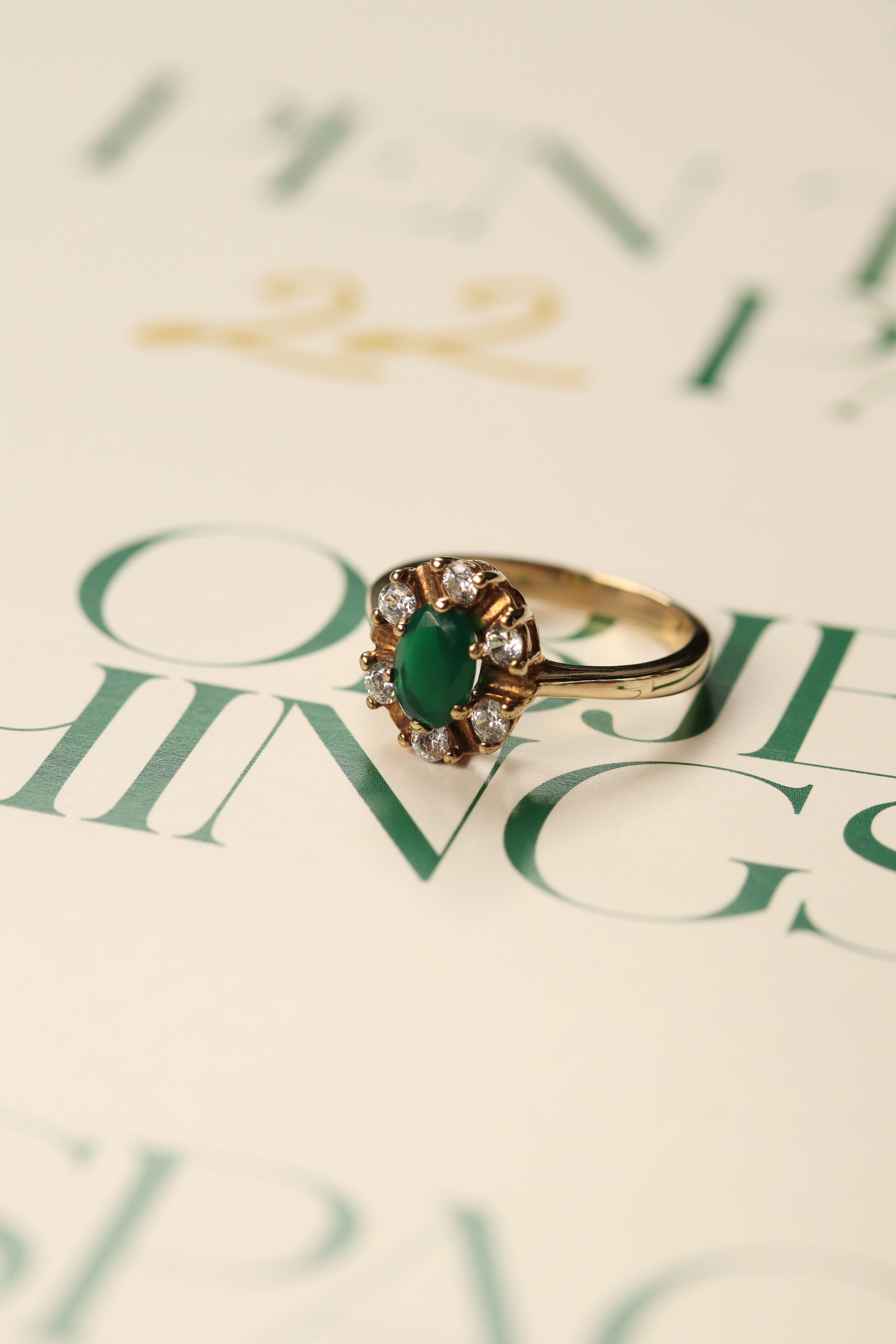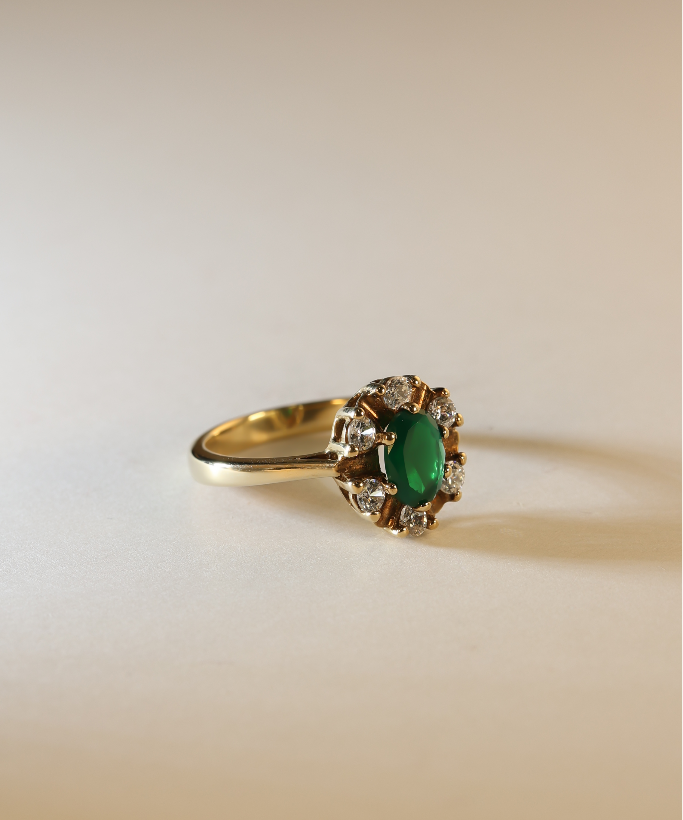 De Vintage Green Solitaire is gemaakt van 9k en is een subtiele statement ring. Met haar heldere groene steen in het midden en de schittering als zonnestralen rond de kern is Iris een erfstuk dat doorgegeven zal worden voor generaties!