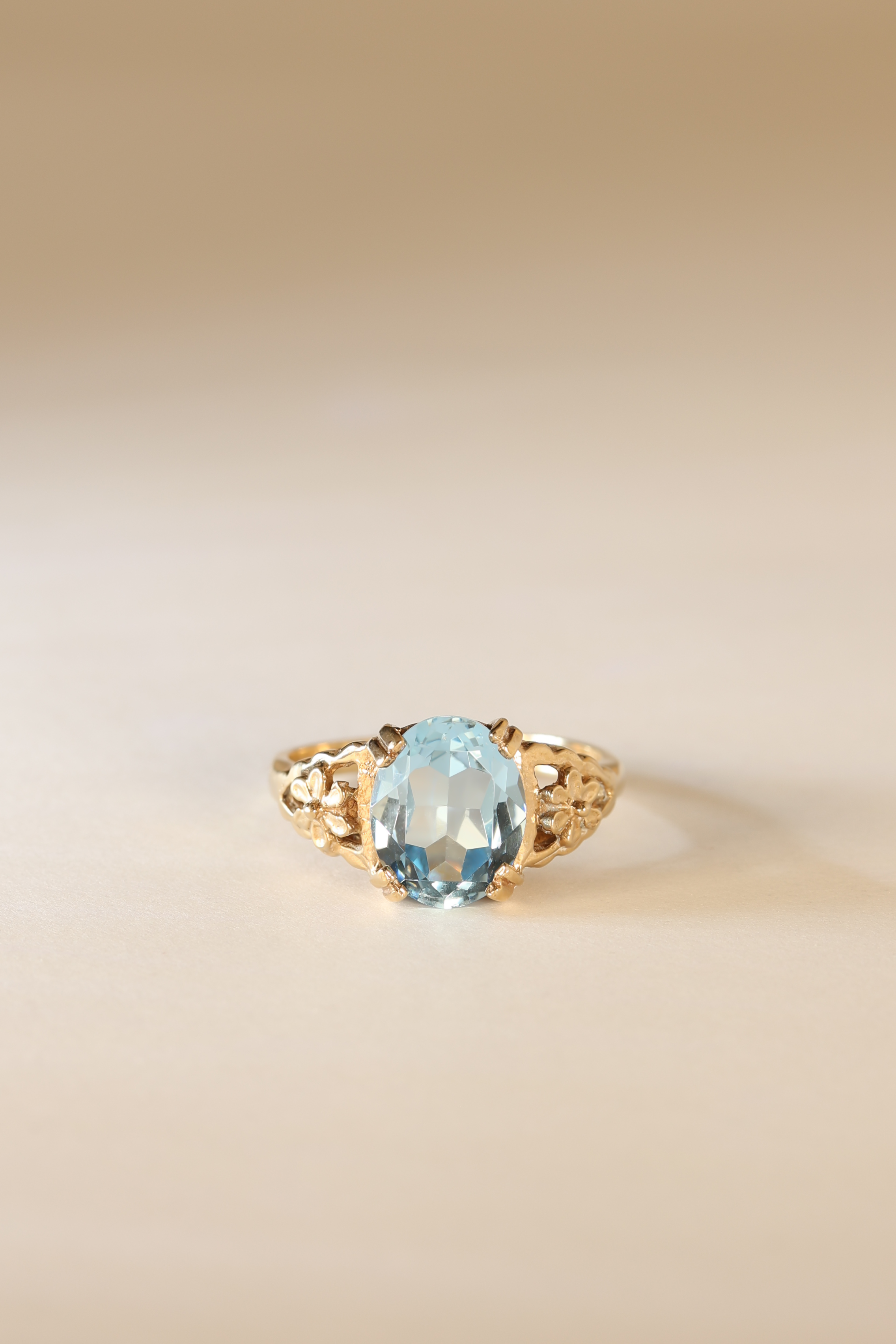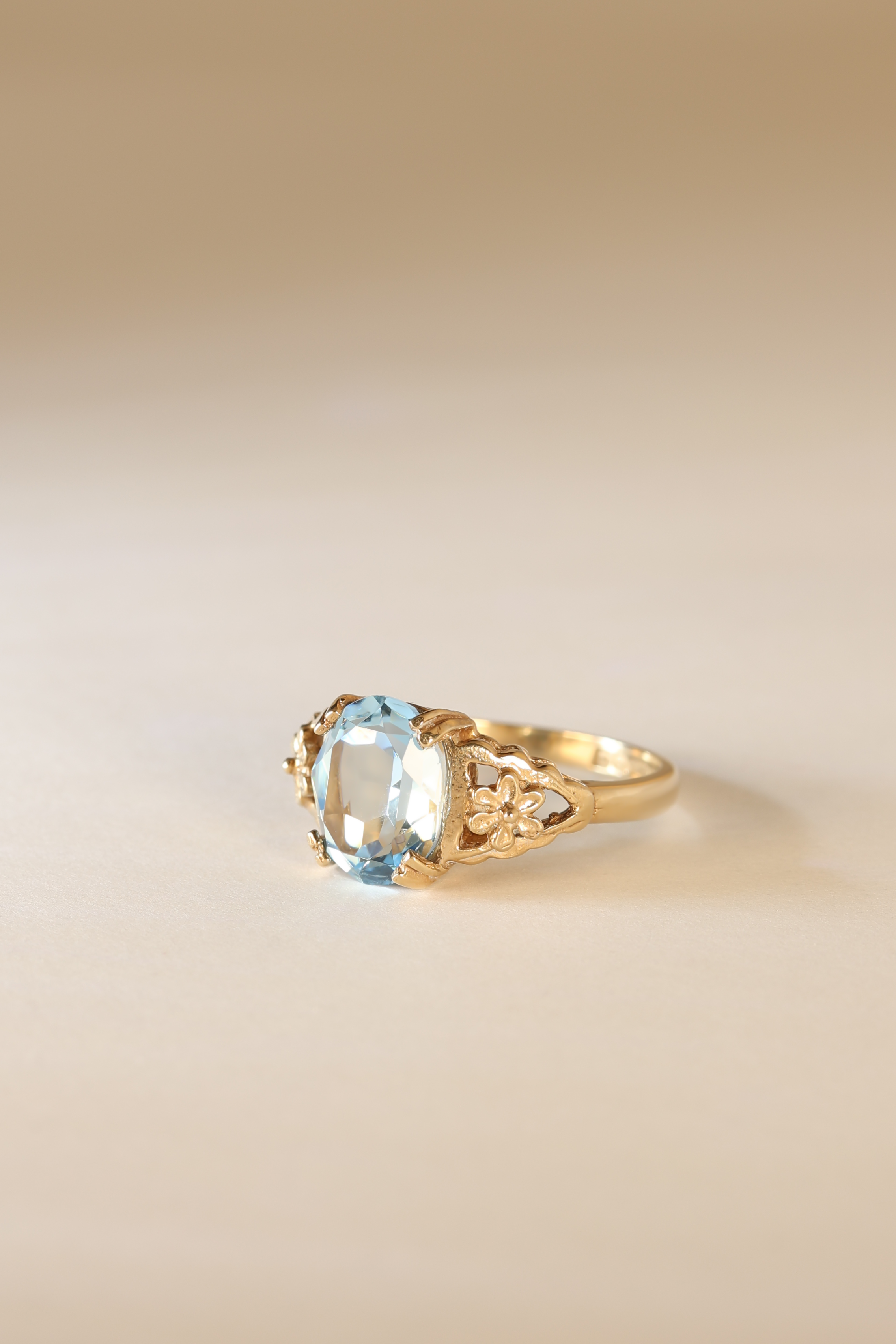 Laat je betoveren door deze 9K Vintage Topaas Ring – een schitterend statementstuk dat elegantie en verfijning uitstraalt. De helderblauwe topaas vangt het licht op adembenemende wijze en geeft elke look een frisse, luxueuze touch. De sierlijke, bloemrijke details in het 9K goud versterken het romantische karakter van deze unieke ring. Perfect voor wie houdt van tijdloze schoonheid met een vleugje vintage allure. Draag haar solo of als stralend middelpunt van jouw ringstack. Een echte must-have voor elke sieradenliefhebber!