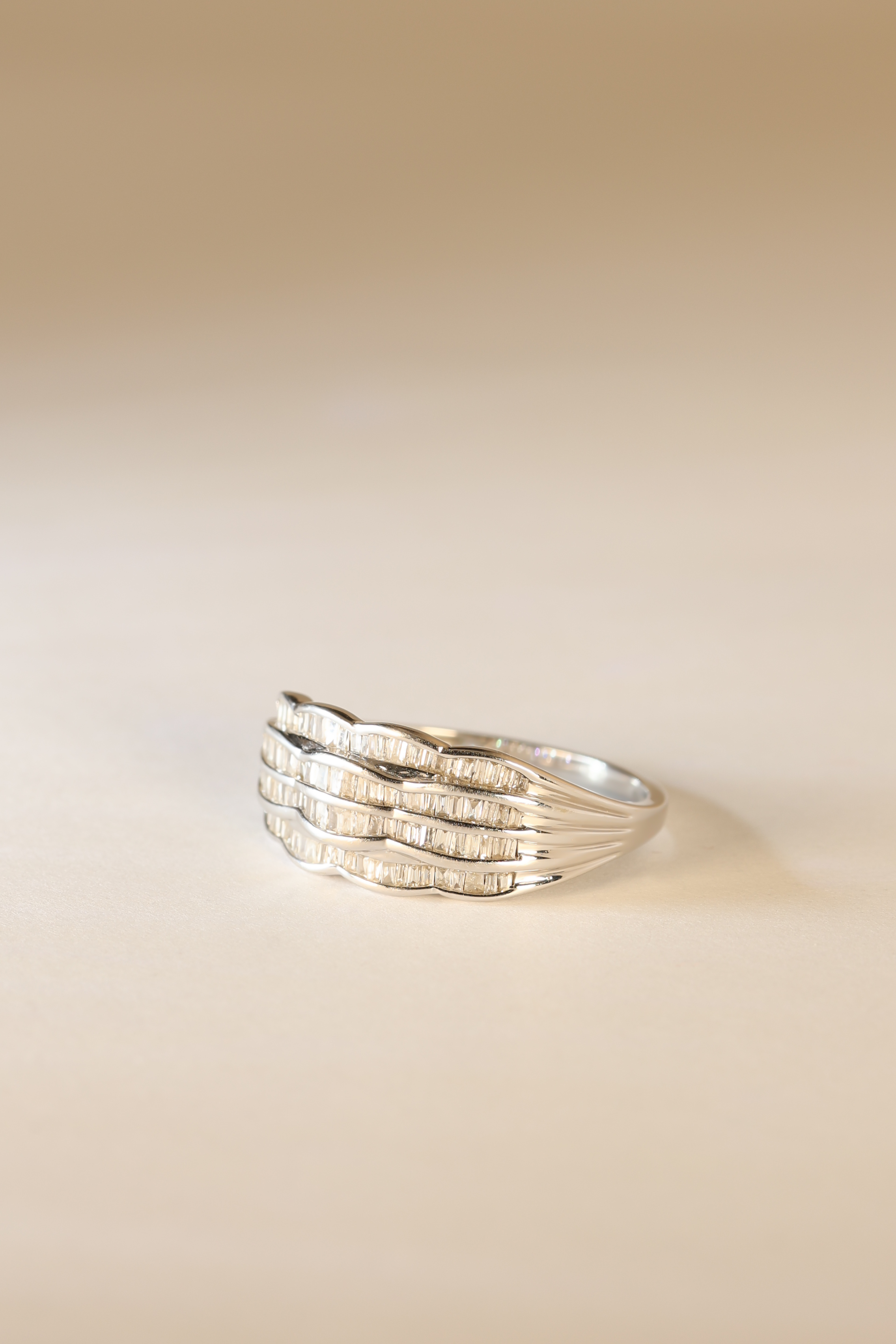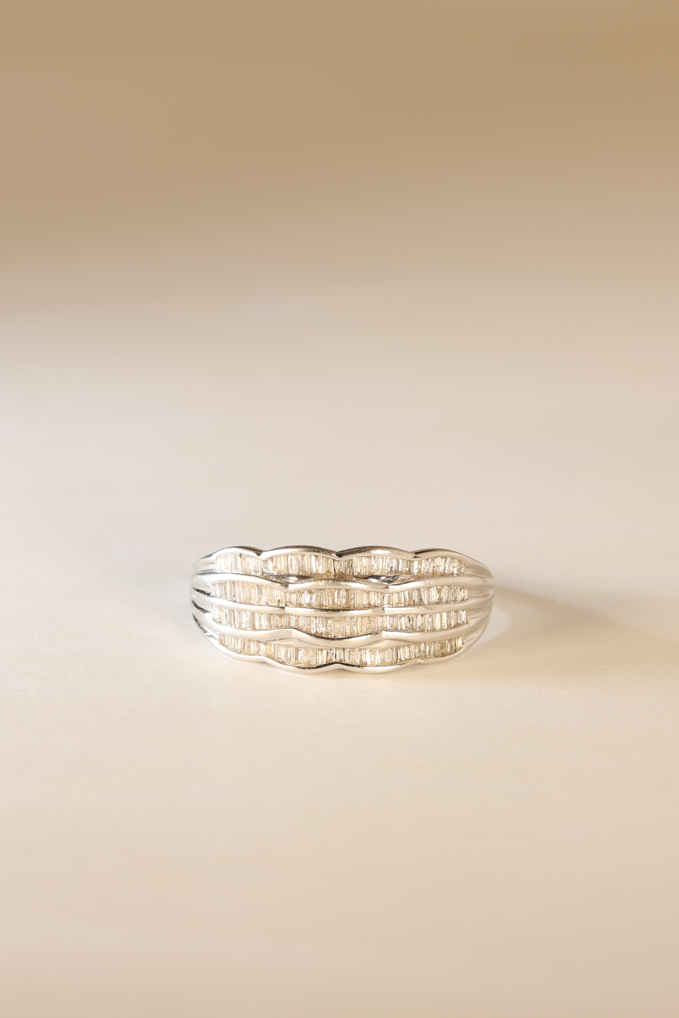 Laat je verrassen door de ingetogen luxe van onze 9K Diamond Wave Ring, een prachtig ontwerp dat raffinement en moderniteit naadloos combineert. De fijne baguette-geslepen diamanten zijn zorgvuldig geplaatst in golvende banen, waardoor de ring een subtiel maar betoverend spel van licht creëert. Het glanzende 9K witgoud versterkt de helderheid van de diamanten en geeft het geheel een elegante, tijdloze uitstraling. Perfect voor wie houdt van verfijnde glamour die moeiteloos bij elke gelegenheid past. Draag haar solo als stijlvolle blikvanger of combineer haar met andere ringen voor een moderne, gelaagde look. Een schitterend sieraad dat klasse en finesse uitstraalt.